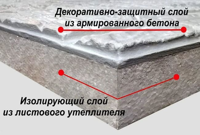 Внешний слой термопанели – декоративно-облицовочный, это прочная фибро-бетонная плита толщиной 20 мм, выполняющая защитную и эстетическую функции.